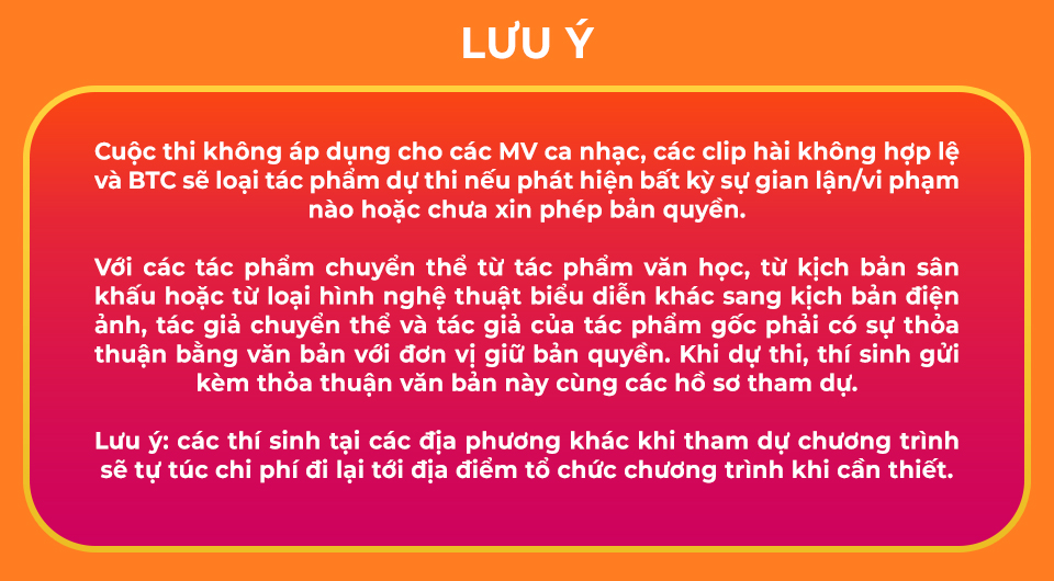 •Thí sinh gửi hồ sơ tham dự bao gồm điền đơn đăng ký bắt buộc (https://forms.gle/GYUN743mRrTu4rxr8) + nộp 1 video phim đã thực hiện trong vòng 3 năm hoặc vừa sản xuất. Vui lòng đọc kỹ phần "Lưu ý" bên dưới để nắm rõ quy định nộp bài.