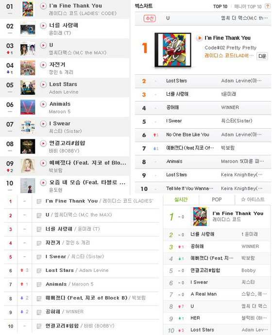 I’m Fine Thank You là MV đầu tiên của Ladies’ Code đứng đầu các bảng xếp hạng nhạc số hot của Hàn gồm Melon, Bugs, Naver Music, Mnet, Genie…