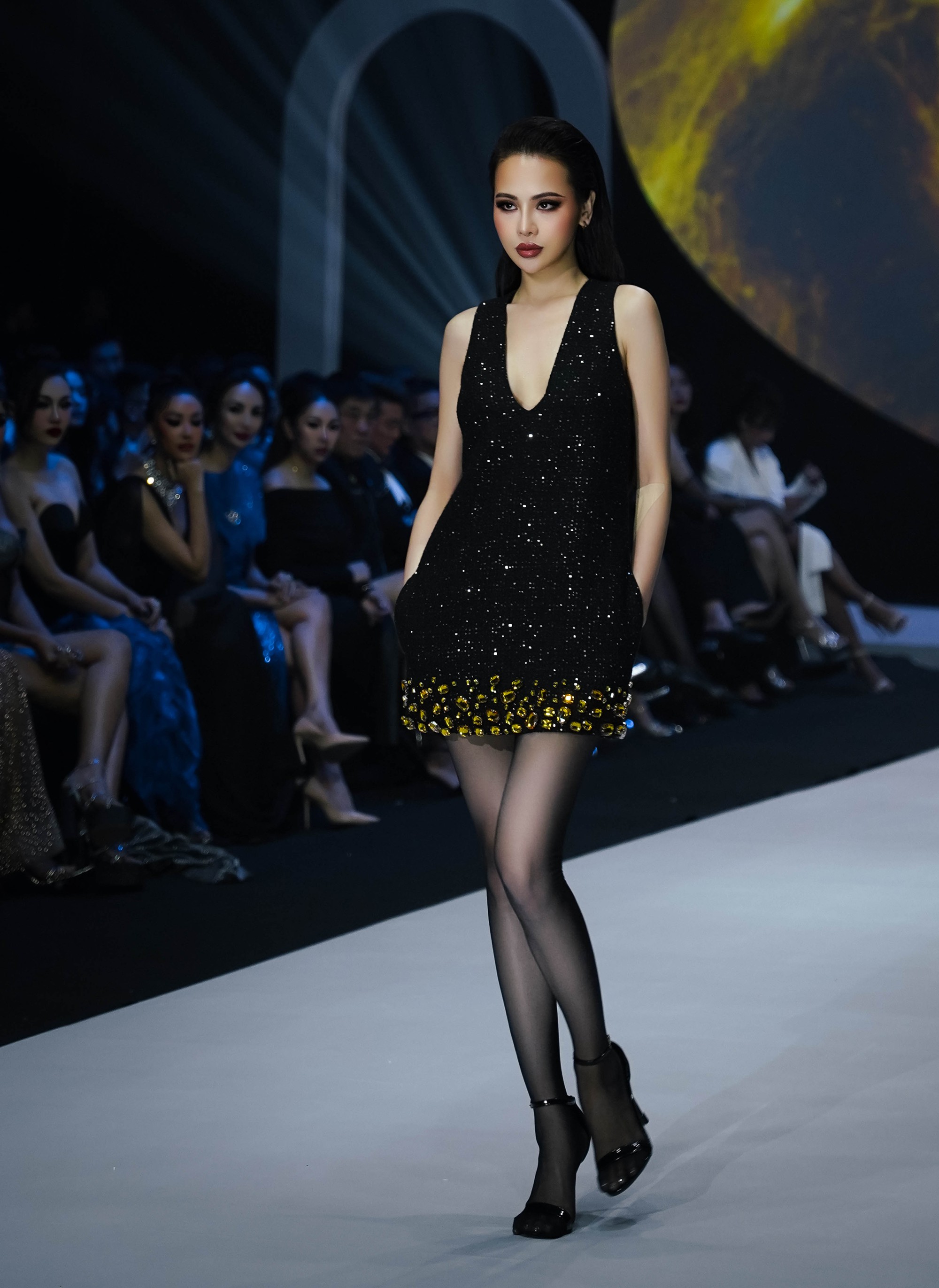 Người đẹp có hơn 10 năm làm người mẫu chuyên nghiệp được chọn đảm nhiệm vị trí vedette cho bộ sưu tập Safari. Cô diện thiết kế tông đen cúp ngực với phần thân trên tạo hình corset đính kết họa tiết trừu tượng và phần tùng xòe bồng xếp tầng thướt tha, lộng lẫy