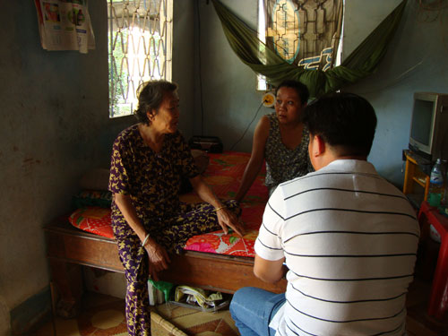 Bà Lê Thị Mười đang trình bày với cán bộ địa chính xã về việc bị thất lạc sổ đỏ - Ảnh: Hoài Nam |