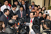 Thủ tướng Nguyễn Tấn Dũng phát biểu trước báo chí - Ảnh: TTXVN - Thủ tướng Nguyễn Tấn Dũng: Tôi hoan nghênh ý kiến đề nghị rất xây dựng này của bạn. Mỗi nước có cách làm khác nhau. Ở Việt Nam chúng ta, không có "Thông điệp đầu năm" của người đứng đầu Chính phủ, mà cuối năm (khoảng tháng 10, tháng 11), Thủ tướng Chính phủ có Báo cáo trước Quốc hội về nhận định, đánh giá tình hình kinh tế-xã hội trong năm; nêu rõ những mặt làm được, làm tốt, những mặt chưa được, chưa tốt; nguyên nhân và đề ra mục tiêu, nhiệm vụ, giải pháp để thực hiện cho cả năm tới. Quốc hội là cơ quan quyền lực cao nhất của nhân dân ta sẽ thảo luận, xem xét Báo cáo của Thủ tướng Chính phủ và có Nghị quyết về nhiệm vụ phát triển kinh tế - xã hội của năm. Chính phủ, Thủ tướng Chính phủ sẽ có chương trình hành động thực hiện Nghị quyết của Quốc hội ngay từ đầu năm. Với điều kiện lịch sử cụ thể của Việt Nam ta, tôi cho rằng như vậy là phù hợp, thiết thực. Rất mong các bạn theo dõi Báo cáo của Thủ tướng Chính phủ trước Quốc hội và Nghị quyết của Quốc hội về tình hình kinh tế - xã hội hằng năm của đất nước ta, trong đó nêu rõ về mục tiêu, nhiệm vụ, giải pháp và chính sách chủ yếu để phát triển các lĩnh vực của đất nước (cả về kinh tế, văn hóa, xã hội, cải cách hành chính, chống tham nhũng, quốc phòng, an ninh, đối ngoại...). Nói cách nào đó, cũng có thể coi đây là thông điệp chính thức hằng năm của Nhà nước ta, của Chính phủ chúng ta. * Kính chào Thủ tướng! Vì sao Thủ tướng lại ký chỉ thị nghiêm cấm tư nhân hóa báo chí dưới mọi hình thức? Như vậy, có đi ngược lại mục tiêu tự do dân chủ mà Thủ tướng phấn đấu hay không? Phạm Dương Quốc Tuấn - Thủ tướng Nguyễn Tấn Dũng: Đúng, tôi có ký chỉ thị nhằm tăng cường sự quản lý của Nhà nước về báo chí để phát huy tối đa nhất, tốt nhất vai trò của báo chí của chúng ta trong sự nghiệp xây dựng và phát triển về mọi mặt của đất nước. Để mỗi tờ báo, tạp chí (với hơn 600 tờ báo, tạp chí) của chúng ta thật sự là cơ quan ngôn luận, thật sự là diễn đàn dân chủ của các tầng lớp nhân dân; để mỗi tờ báo, mỗi tạp chí là một ngọn cờ chiến đấu của nhân dân ta vì mục tiêu một nước Việt Nam xã hội chủ nghĩa, dân giàu nước mạnh, xã hội công bằng, dân chủ, văn minh. Trong chỉ thị tôi ký có nghiêm cấm không được tư nhân hóa báo chí với bất cứ hình thức nào và không được để bất cứ thế lực nào chi phối báo chí để phục vụ ý đồ riêng trái pháp luật, gây phương hại cho đất nước. Đây là chỉ thị của Thủ tướng Chính phủ đúng theo quy định của pháp luật hiện hành, đúng theo ý chí nguyện vọng của tuyệt đại đa số nhân dân ta, đồng bào ta, phù hợp với điều kiện lịch sử cụ thể của đất nước ta. Mọi việc làm tốt, làm hay của báo chí phải được trân trọng và khen thưởng thỏa đáng, kịp thời, đồng thời mọi vi phạm về hoạt động báo chí cũng phải được xem xét, xử lý nghiêm minh đúng pháp luật. Đảng, Nhà nước và nhân dân ta vui mừng về những bước trưởng thành vượt bậc, về sự phát triển rất nhanh và toàn diện của các loại hình báo chí Việt Nam. Chúng ta đánh giá rất cao sự đóng góp tích cực, quan trọng của báo chí vào thành tựu chung của đất nước trong sự nghiệp đổi mới suốt 20 năm qua. Chúng ta luôn mong muốn và tạo mọi điều kiện thuận lợi để báo chí Việt Nam tiếp tục vươn lên, phát huy ưu điểm, tiến bộ, ra sức khắc phục những yếu kém để làm tốt hơn nữa vai trò quan trọng của mình; đóng góp xứng đáng hơn nữa vào sự nghiệp phát triển đất nước, luôn xứng đáng với truyền thống tốt đẹp và lòng tin cậy của Đảng, Nhà nước và nhân dân ta. * Thưa Thủ tướng, một số vị bộ trưởng hiện nay khả năng yếu kém, bất tài, dư luận đã lên tiếng chỉ trích nhưng vẫn đương chức đương quyền. Vậy Thủ tướng có động thái gì, cải đổi gì và phải thay đổi chính sách sử dụng, bổ nhiệm nhân sự hiện nay như thế nào để có được người có tài, có tâm phục vụ đất nước? Tạ Anh Tuấn, Ngô Văn Nghị (TP.HCM) - Thủ tướng Nguyễn Tấn Dũng: Cho rằng một số vị bộ trưởng hiện nay khả năng yếu kém, bất tài, nhận xét như vậy là quá khắt khe, là không thật khách quan. Chính phủ của ta hiện nay có 26 bộ trưởng và là thành viên Chính phủ, từng bộ trưởng đều có ưu điểm, khuyết điểm, đều có mặt mạnh, mặt yếu, nhưng ưu điểm, mặt mạnh, mặt tốt vẫn là chủ yếu. Hiện nay, không có bộ trưởng nào vi phạm pháp luật, vi phạm đạo đức phẩm chất phải xem xét, xử lý. Với mức độ khác nhau, nhưng nhìn chung các bộ trưởng của chúng ta rất nỗ lực, rất trách nhiệm và đã cơ bản hoàn thành chức trách, nhiệm vụ được giao, đóng góp tích cực vào thành tựu chung. Tuy nhiên, chúng tôi cũng nghi