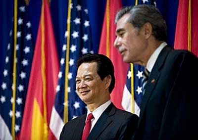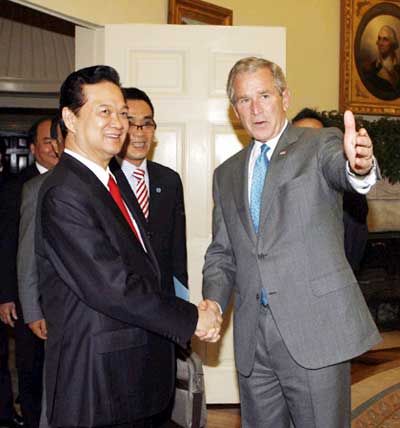 Thủ tướng Nguyễn Tấn Dũng cảm ơn Tổng thống G.Bush và nhân dân Hoa Kỳ đã dành cho Đoàn đại biểu cấp cao Chính phủ Việt Nam sự tiếp đón nồng hậu. Tổng thống G.Bush nhắc lại ấn tượng tốt đẹp về chuyến thăm Việt Nam mới đây, cảm ơn Chính phủ và nhân dân Việt Nam đã đón tiếp nồng nhiệt ông và phu nhân. Ông bày tỏ vui mừng trước những thành tựu phát triển kinh tế của Việt Nam, hoan nghênh quyết tâm của Chính phủ Việt Nam ổn định kinh tế vĩ mô. Hai nhà lãnh đạo đánh giá quan hệ song phương Việt Nam và Hoa Kỳ đang tiến triển mạnh mẽ, năng động và nhất trí thúc đẩy quan hệ đối tác xây dựng, hữu nghị, hợp tác nhiều mặt, trên cơ sở bình đẳng, tôn trọng lẫn nhau và cùng có lợi, phát triển ngày càng sâu rộng, vững chắc và hiệu quả hơn vì lợi ích của nhân dân hai nước, vì hòa bình, an ninh, ổn định và hợp tác phát triển ở Đông Nam Á và châu Á.