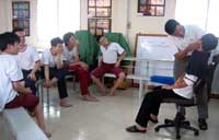 "Hôm nay chúng ta ôn lại bài cũ nhé! Em nào cho thầy biết con trai khác con gái ở điểm nào nè?". Thầy Thành Nguyên vừa đặt câu hỏi, ba bốn cánh tay liền giơ lên. "Con trai với con gái khác nhau ở bộ phận sinh dục. Con gái có vú, con trai không có. Con trai tóc dài, con gái tóc ngắn" - Bình vừa chỉ vào hai tấm hình con trai, con gái trên bảng vừa phát biểu. Nghe đến đây, cả lớp cười ồ lên. Quân nhanh nhảu: "Sai rồi! Con trai tóc ngắn, con gái tóc dài". Sang chưa hài lòng, tiếp tục bổ sung: "Con trai cũng được để tóc dài nhưng không thích thắt bím, uốn tóc như con gái. Con gái để móng chân sơn cho đẹp, con trai không cần". Không khí lớp học sôi nổi ngay từ phút đầu. Khuôn mặt ngây ngô, khờ khạo thường ngày của các em trở nên hào hứng lạ. Thật khó tin những cậu bé đang học cách phân biệt con trai, con gái ấy đã ở độ tuổi 14-18. Thầy Thanh Tân cho biết: "Trẻ chậm phát triển trông bề ngoài cao lớn bình thường vậy nhưng thực chất tâm hồn chẳng khác nào trẻ con". Còn thầy Nguyên cho biết: "Dạy a, bờ, cờ cho các em đã khó, giáo dục giới tính còn khó hơn nhiều. Kiến thức thì trừu tượng mà các em tiếp thu rất chậm. Vì vậy, không thể nói bằng lời, phải dùng hình vẽ, phim ảnh, diễn kịch để bài học trực quan, sinh động giúp các em dễ hiểu, dễ nhớ hơn".