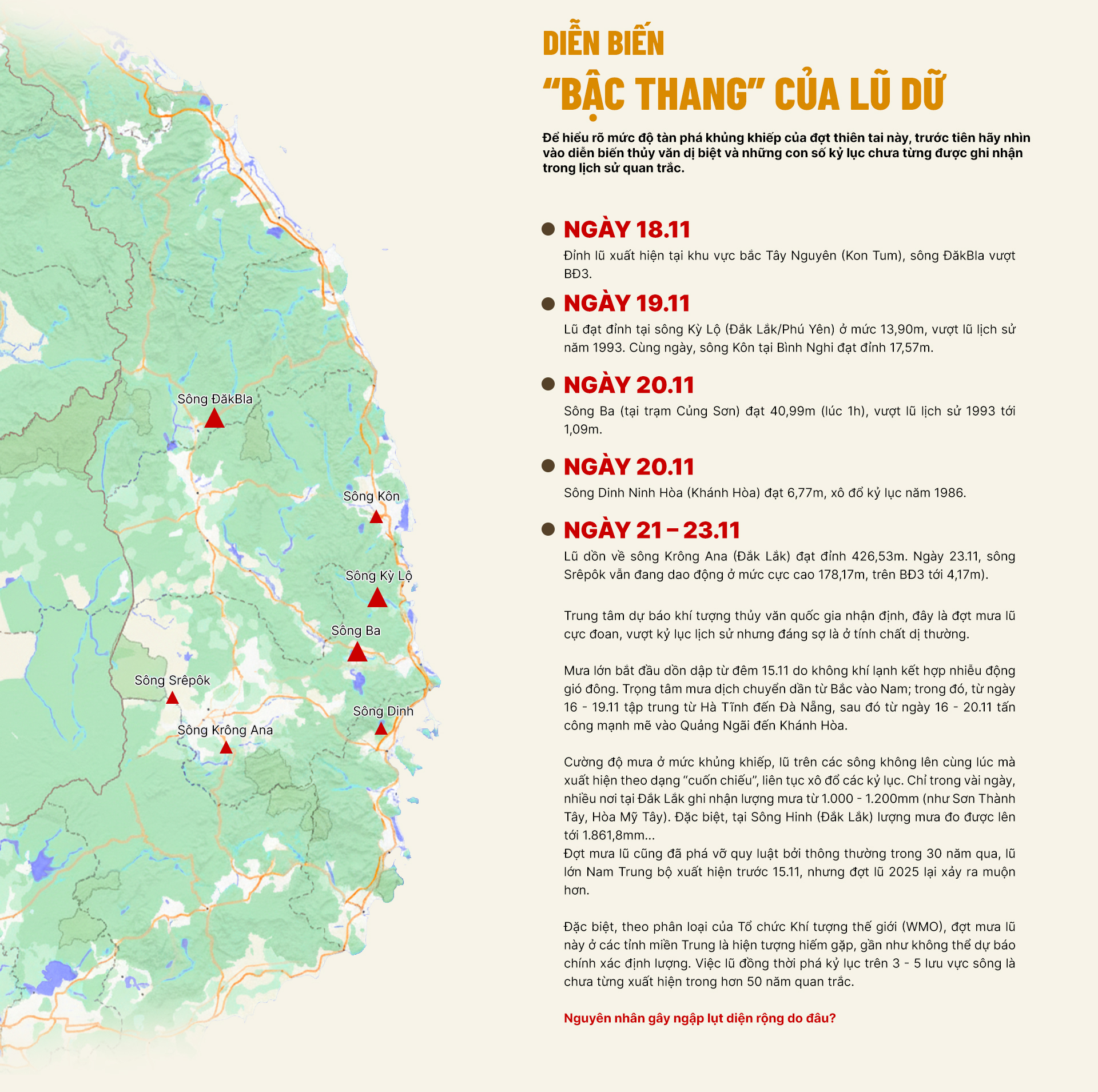 Trong khi đó, dãy Trường Sơn đóng vai trò "bức tường chắn gió", kích thích đối lưu mạnh khiến mưa trút xuống xối xả và kéo dài, vượt xa khả năng tiêu thoát tự nhiên. Khi lượng mưa tích lũy từ tháng 10 đến giữa tháng 11 đã cao hơn trung bình nhiều năm 120 - 200%, khiến đất đai bão hòa. Chỉ cần mưa bổ sung 300 - 500mm là lũ lớn hình thành, trong khi thực tế mưa lên tới 800 - 1.700 mm.