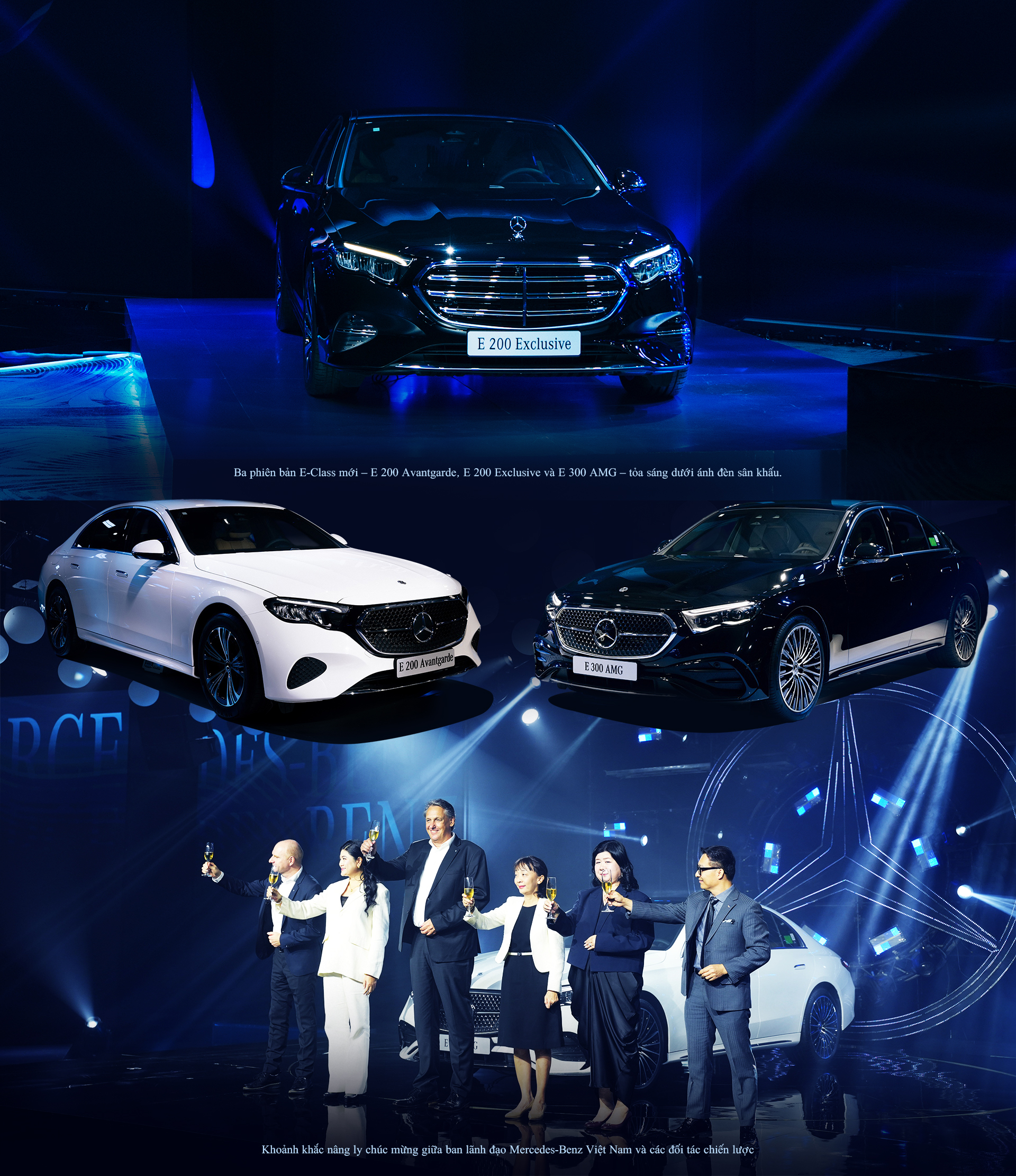 Ba phiên bản được giới thiệu gồm E 200 Avantgarde, E 200 Exclusive và E 300 AMG, đánh dấu sự kết hợp hoàn hảo giữa phong cách thanh lịch và đổi mới công nghệ. E-Class thế hệ mới còn đánh dấu bước tiến vượt bậc với loạt tính năng lần đầu tiên xuất hiện trong dải sản phẩm Mercedes-Benz tại Việt Nam: MBUX Superscreen, dải đèn hậu có logo 3D Ngôi sao ba cánh, Selfie Camera bên trong khoang lái, Digital Vent Control, Sound Visualization và camera giám sát tài xế – tất cả cùng tạo nên trải nghiệm lái xe hiện đại, thông minh và đầy cảm hứng.