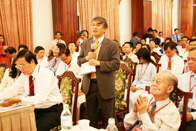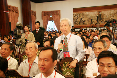 Ông Nguyễn Trí Dũng (Việt kiều Nhật) đang đặt câu hỏi với Bộ trưởng Thương mại Trương Đình Tuyển |