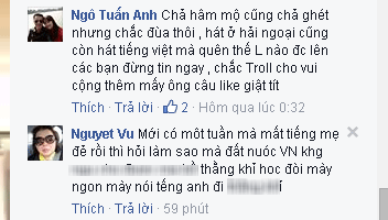 Nickname Mr Nguyen Singapore Seriously viết: "Tôi ở nước ngoài 15 năm vẫn không quên một từ. Đàm Vĩnh Hưng thích "nai Tây" hà. Em nghệ sĩ này khó chịu quá. Chả hiểu nghĩ sao, bập bé mấy câu nói không chuẩn tiếng Anh. Xạo quá".