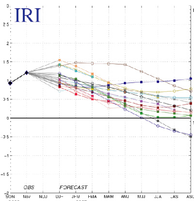 Đa số các thống kê kết hợp, bao gồm Hệ thống dự báo khí hậu Mỹ (CFS/NCEP), đều chỉ ra rằng sự dị thường của nhiệt độ nước biển đã gần mức tối đa và sự suy giảm có thể diễn ra từ tháng 1 đến tháng 5/2007. Những quan sát mới đây thiên về ủng hộ các dự báo trên. Sự hạ nhiệt này trên đại dương ở vùng trung tâm xích đạo Thái Bình Dương sẽ tiến tới phía đông, kết hợp phân rẽ hoạt động của mô hình sóng được biểu thị tại thang nhiệt lượng Kelvin.