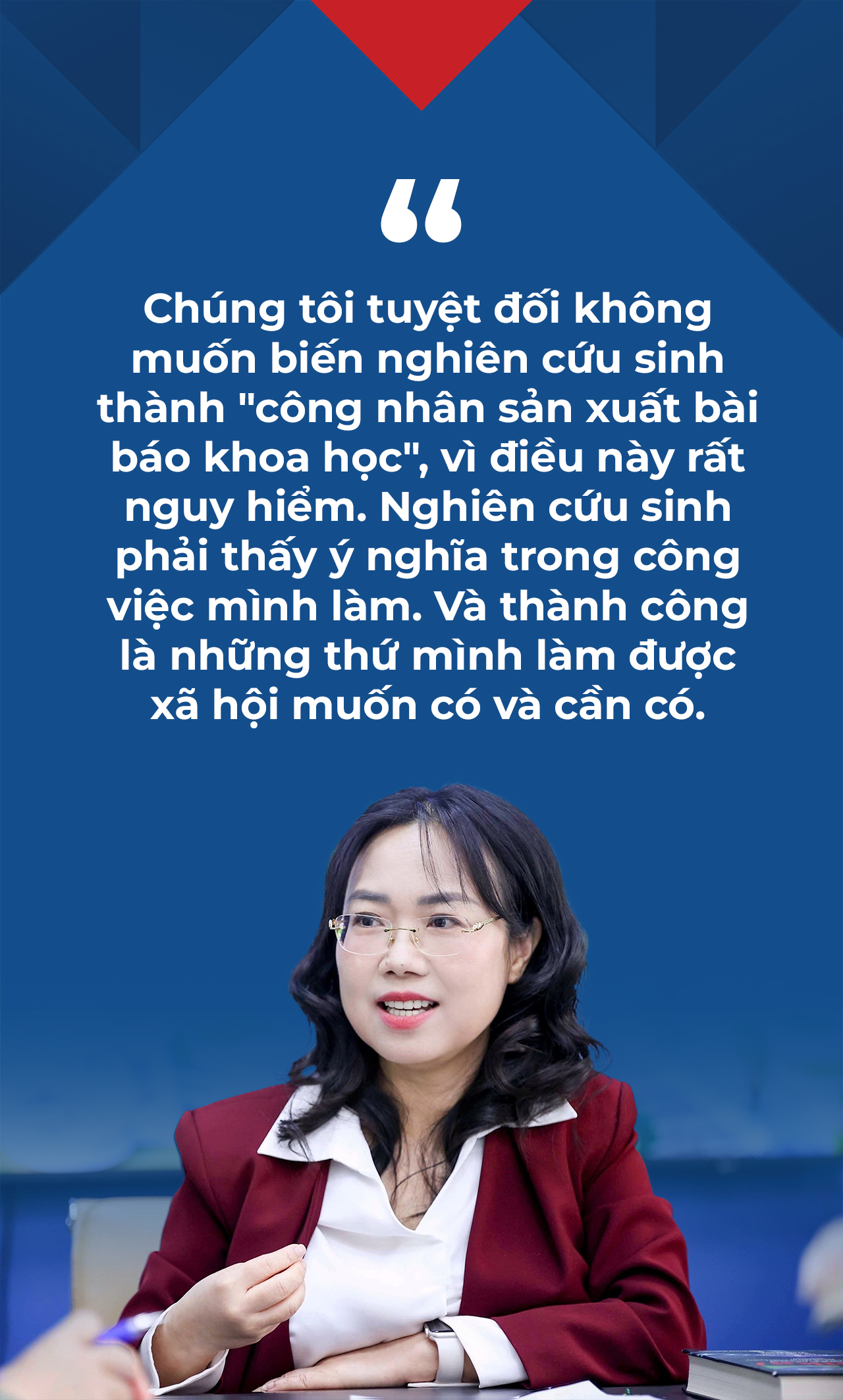Câu hỏi đặt ra với chúng tôi là làm sao đào tạo được nhân tài từ hệ sau ĐH? Chúng tôi tuyệt đối không muốn biến nghiên cứu sinh thành "công nhân sản xuất bài báo khoa học", vì điều này rất nguy hiểm. Nghiên cứu sinh phải thấy ý nghĩa trong công việc mình làm. Và thành công là những thứ mình làm được xã hội muốn có và cần có. Giải quyết vấn đề này, vai trò của người hướng dẫn rất quan trọng.