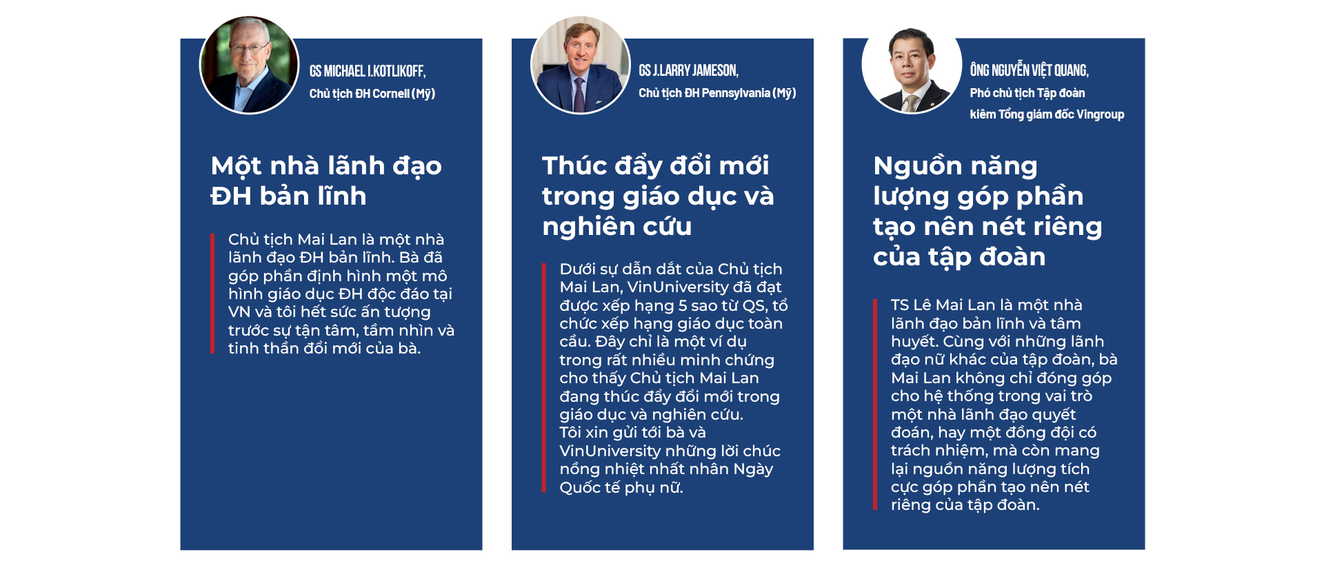 Thành thực mà nói, chúng tôi mới chỉ đạt thành công bước đầu trong mô hình đại học giảng dạy. Chúng tôi đã có những sinh viên xuất sắc. VinUni đang chuyển sang mô hình ĐH nghiên cứu, đặt mục tiêu vào top 100 ĐH hàng đầu thế giới thì ngoài học giỏi, trường cần thu hút và đào tạo được học viên có 3 phẩm chất: tư duy toàn cầu, bản lĩnh toàn cầu và tiếp cận thông tin dữ liệu toàn cầu.