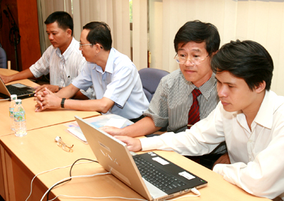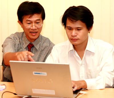 Ông Nguyễn Đức Hiệp (trái), đang tư vấn cho các thí sinh. |