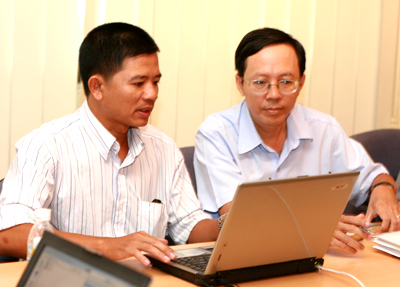 Ông Phạm Ngọc Tiến (phải), đang giải đáp các thắc mắc cho thí sinh. Ảnh Ngọc Thạch |