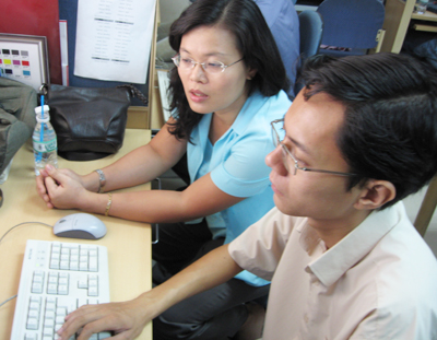 BS Hoàng Thị Diễm Tuyết (áo xanh) đang trả lời trực tuyến các câu hỏi của bạn đọc. Ảnh Ngọc Thọ |