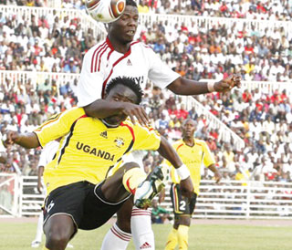 Allan Wanga (phía sau) trong trận gặp Uganda - Ảnh: Reuters |