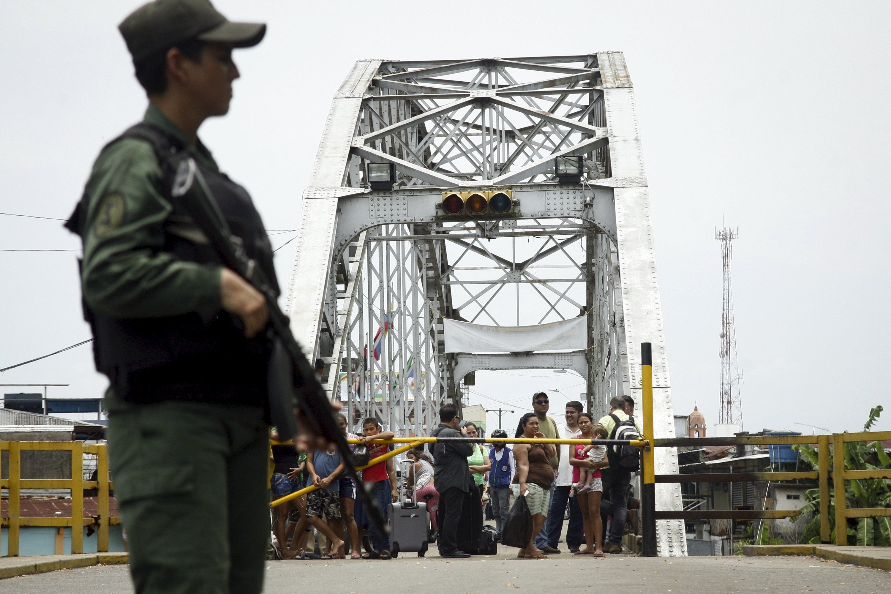 Người dân đứng chờ tại một cây cầu đã bị đóng lại tại biên giới Venezuela - Colombia - Ảnh: Reuters |