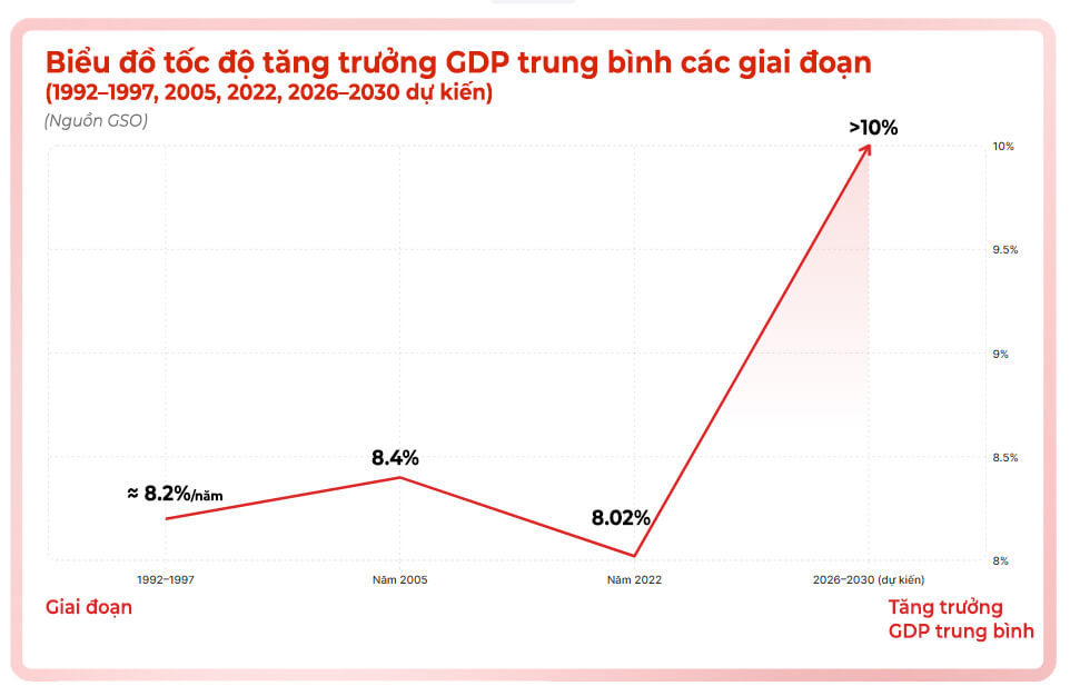 Để tránh nguy cơ rơi vào bẫy thu nhập trung bình, đứng vào top các nước phát triển, tốc độ tăng trưởng GDP phải đột phá lên hai con số trong giai đoạn 2026 - 2030. Dưới sự chỉ đạo của Tổng Bí thư, một cuộc cách mạng thần tốc đã được triển khai trong thời gian ngắn từ “sắp xếp lại giang sơn”, tinh gọn bộ máy, sáp nhập các bộ, ngành, địa phương, thực hiện chính quyền 2 cấp; cho đến nỗ lực cải cách thể chế “điểm nghẽn của điểm nghẽn” và triển khai bộ tứ trụ cột (nghị quyết 57, 59, 66, 68)...