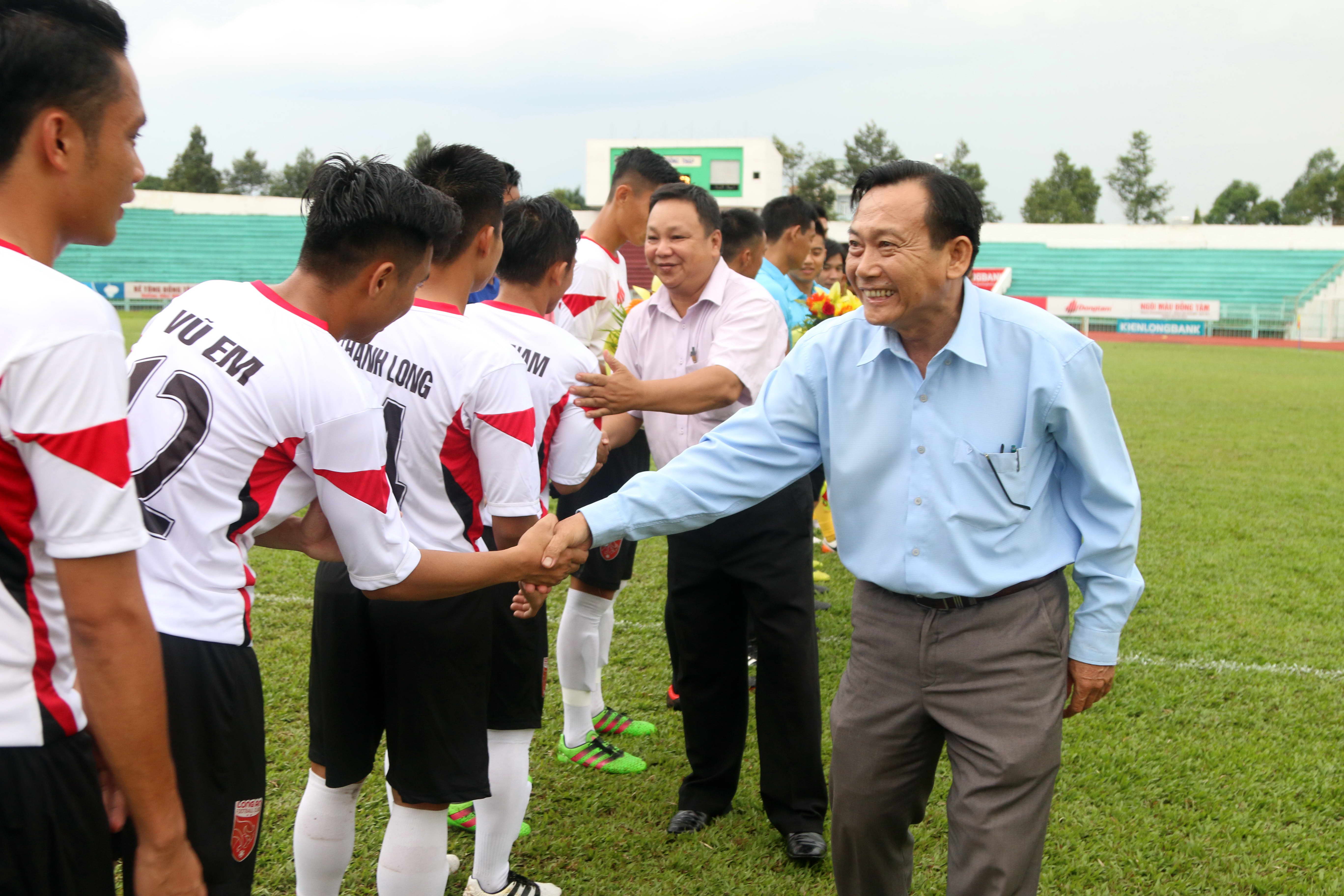 Giám đốc Sở Văn hóa - Thể thao và Du lịch Long An Nguyễn Anh Dũng và ủy viên Ban tổ chức giải, Trưởng ban thể thao Báo Thanh Niên Trần Quang Tuyến xuống sân động viên hai đội