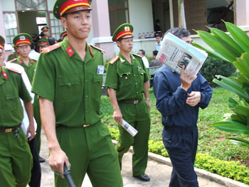 Bị cáo Dương Văn Lực lấy báo che mặt khi gặp ống kính phóng viên |