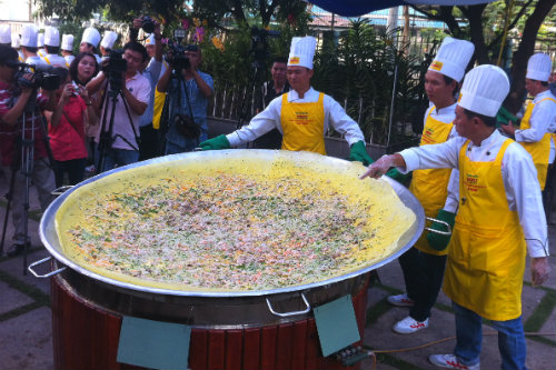 Chiếc bánh xèo khổng lồ được chế biến trên chảo nhôm đường kính 2 mét nặng 35 kg. 5 nhân viên lành nghề đã mất 30 phút để thực hiện.