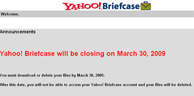 Cũng theo thông báo từ Yahoo! Briefcase, trước ngày 30.3.2009, người dùng nên tải và xóa những tập tin đã lưu trữ trên Yahoo! Briefcase. Sau thời gian này, tài khoản người dùng sẽ bị khóa và mọi tập tin lưu trữ trên Yahoo! Briefcase sẽ bị xóa.